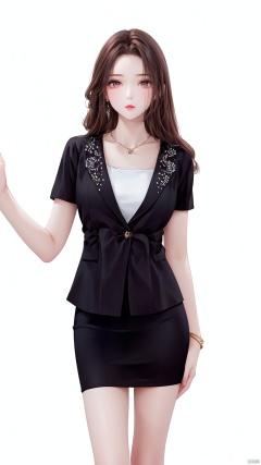 1girl, solo, long hair, looking at viewer, skirt, simple background, brown hair, black hair, white background, jewelry, short sleeves, cowboy shot, earrings, black skirt, necklace, bracelet, formal, pencil skirt, Pink lips——Clear hand contour,Hand intact,Five fingers of the hand are clear, loli, ((poakl))<lora:EMS-93-EMS:0.800000>, <lora:EMS-254762-EMS:0.500000>, <lora:EMS-346315-EMS:0.800000>