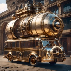 The best quality, masterpiece, steampunk, steampunk world, steampunk RV, steampunk architectural background, complex structure, super details, metallic texture, high reflection, ultra wide angle lens,