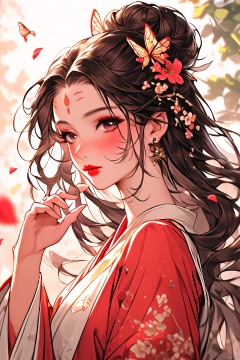 (\hui mou\), 1girl, solo, hair ornament, jewelry, earrings, petals, flower, upper body, long hair, chinese clothes, long sleeves, blurry, hair flower, falling petals, bug, black hair, butterfly, blurry background, hand up, dress, hanfu, forehead mark, light particles, hair bun, facial mark, from side, brown eyes, closed mouth, brown hair, red lips, eyelashes, blush, jijianchahua