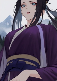 solo,highly detailed,(best quality),((masterpiece)),1girl,black hair,blue eyes,long hair,peiyuhan,hanfu,see-through,ggbh,looking_at_viewer,evil,from below,mountain,forest,upper body, zhangshiyao,bangs pinned back,hair bun,purple clothes,