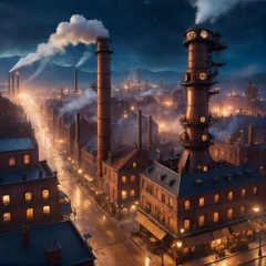 industrial city, surround by wall, steampunk. there is inn, residental area, ((airships)) in the sky, city gate, rusty and heavy, smoke, chimney, factories, gears, machinery, tall buildings, towers, steam power, steam pipes, streetlights, (bird-eye view), (night time, starry sky), (hard rain), (crossroad), (cinematic lighting, super detail, bloom)
