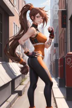 masterpiece, best quality, dnfstriker, ponytail, orange sleeveless turtleneck, black leggings, fingerless gloves, black leggings, orange shoes, standing, clenched fist, hand to hip, from side, looking at viewer, furrowed brow, smile, city street <lora:striker-nvwls-v2-000010:0.9>