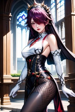 1girl, rosaria \(genshin impact\), solo, breasts, fishnet pantyhose, gloves, fishnets, looking at viewer, pantyhose, nun, bare shoulders, red hair, white gloves, elbow gloves, habit, church, red eyes, purple hair, belt, parted lips, lips, large breasts, red lips, hair over one eye, multicolored hair, veil, petals, cowboy shot, dress, blush, hair between eyes, sleeveless, medium breasts, makeup, black dress, streaked hair, short hair, detached sleeves, indoors, two-tone dress, pelvic curtain, multicolored clothes, thighs, purple eyes, claw ring, multicolored headwear, lipstick, covered nipples, sideboob, white dress, falling petals, taut clothes, swept bangs, eyelashes