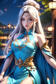 1girl, solo, dress, long hair, white hair, white dress, night, sky, blue eyes, hair ornament, looking at viewer, jewelry, night sky, chinese clothes, sitting, lantern, upper body, closed mouth, cloud, breasts, railing, outdoors, bare shoulders, china dress, star \(sky\), blue dress, earrings, water, tree, bracelet, expressionless, sleeveless, medium breasts, lamp, hair bun