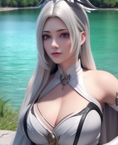<lora:584-DA-星辰变-白灵:0.8>(,1girl, ,best quality, ),looking at viewer,  ,ultra detailed 8k cg, ultra detailed background,  ,masterpiece, (( , )) , lake,upper body,   (cleavage), (),