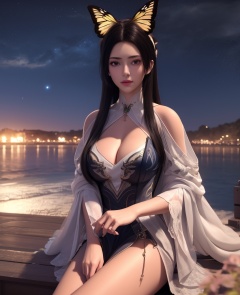 <lora:584-DA-星辰变-白灵:0.8>(,1girl, ,best quality, ),looking at viewer,  ,ultra detailed background,ultra detailed background,ultra realistic 8k cg, ,masterpiece, (( , )),,  fiction,mole, , ,      ,, 1girl,butterfly sitting,  night, star_\(sky\)(cleavage),