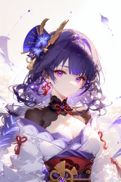 1girl, raiden shogun, solo, japanese clothes, purple hair, purple eyes, kimono, looking at viewer, mole under eye, mole, hair ornament, long hair, bangs, obi, sash, electricity, braid, breasts, flower, earrings, purple kimono, jewelry, armor, petals, closed mouth, shoulder armor, obiage, cleavage, obijime, braided ponytail, large breasts, long sleeves, bridal gauntlets, tomoe \(symbol\), wide sleeves, purple flower, tassel, upper body, ribbon