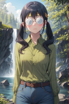 <lora:Saori-000014:0.8>,Saori cyql,1girl,looking at viewer,solo,twintails,black hair,long hair,headband,glasses,@_@,round eyewear,coke-bottle glasses,shirt,collared shirt,green shirt,long sleeves,belt,pants,blush,blue pants,denim,buttons,crazy_smile,full_shot,beautiful face,beautiful eyes,glossy skin,shiny skin,Waterfall, Forest, Rocks, Mist, Trees, River, Rainbow, Serenity,(Sunflowers, Bees, Rustling stalks, Sunshine, Yellow hues, Summer heat:0.5),beautiful detailed sky,beautiful detailed glow,posing in front of a colorful and dynamic background,masterpiece,best quality,beautiful and aesthetic,contrapposto,female focus,wallpaper,fashion,