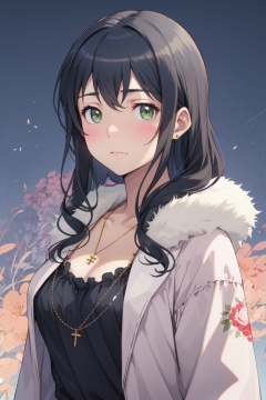 <lora:Saori-000014:0.8>,Saori cyql,1girl,looking at viewer,solo,black hair,long hair,green eyes,necklace,jewelry,blush,Faux shearling coat in a warm caramel shade,smirk,bust,beautiful face,beautiful eyes,glossy skin,shiny skin,Glacier, Peaks, Mountains, Ice, Blue, Crevasse, Serenity, Wilderness,(California poppies, Spring blooms, Poppy field, Vibrant colors, Springtime explosion, California landscape:0.5),beautiful detailed sky,beautiful detailed glow,posing in front of a colorful and dynamic background,masterpiece,best quality,beautiful and aesthetic,contrapposto,female focus,wallpaper,fashion,