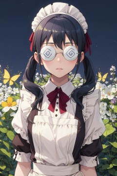 <lora:Saori-000014:0.8>,Saori cyql,1girl,looking at viewer,solo,twintails,black hair,long hair,glasses,@_@,round eyewear,coke-bottle glasses,maid,maid headdress,apron,sleepy,upper_body,beautiful face,beautiful eyes,glossy skin,shiny skin,Meadow, Flowers, Grass, Alps, Sunshine, Breeze, Butterflies, Melting snow,(Water lilies, Lotus flowers, Cattails, Willow trees, Reflections, Warm hues:0.5),beautiful detailed sky,beautiful detailed glow,posing in front of a colorful and dynamic background,masterpiece,best quality,beautiful and aesthetic,contrapposto,female focus,wallpaper,fashion,