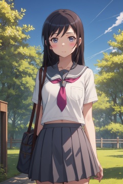 <lora:Ayase-000015:0.8>,Ayase cyql,1girl,looking at viewer,solo,long hair,black hair,blue eyes,blush,school uniform,kousaka kirino's school uniform,serafuku,skirt,pleated skirt,grey skirt,laughing,upper_body,beautiful face,beautiful eyes,glossy skin,shiny skin,Bamboo, Grove, Breeze, Peaceful, Tranquility, Nature, Serenity, Zen,(Cherry blossoms, Country lane, Blossom petals, Springtime charm, Rural tranquility, Cherry blossom drift:0.5),beautiful detailed sky,beautiful detailed glow,posing in front of a colorful and dynamic background,masterpiece,best quality,beautiful and aesthetic,contrapposto,female focus,wallpaper,fashion,