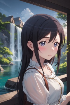 <lora:Ayase-000015:0.8>,Ayase cyql,1girl,looking at viewer,solo,long hair,black hair,blue eyes,blush,Floral print smocked sundress with puff sleeves and a ruffled hem,sad,portrait,beautiful face,beautiful eyes,glossy skin,shiny skin,Fjord, Glacier, Icebergs, Turquoise water, Mountains, Waterfalls, Seals, Exploration,(Moss-covered stones, Moss garden, Spring rain, Zen serenity, Refreshing drizzle, Japanese tranquility:0.5),beautiful detailed sky,beautiful detailed glow,posing in front of a colorful and dynamic background,masterpiece,best quality,beautiful and aesthetic,contrapposto,female focus,wallpaper,fashion,