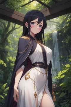 <lora:Ayase-000015:0.8>,Ayase cyql,1girl,looking at viewer,solo,long hair,black hair,blue eyes,blush,Dramatic cape sleeve dress with cascading embellishments,smirk,bust,beautiful face,beautiful eyes,glossy skin,shiny skin,Rainforest, Trees, Foliage, Undergrowth, Waterfall, Humidity, Wildlife, Canopy,(Sea oats, Beach grass, Sand dunes, Sea breeze, Soft twilight, Seagulls:0.5),beautiful detailed sky,beautiful detailed glow,posing in front of a colorful and dynamic background,masterpiece,best quality,beautiful and aesthetic,contrapposto,female focus,wallpaper,fashion,