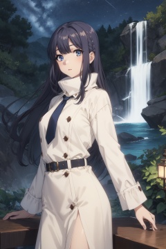 <lora:Shoko-000014:0.8>,Shoko CYQL,1girl,looking at viewer,solo,black_hair,long_hair,bangs,braid,blue_eyes,Wool-blend wrap coat with a funnel neck and self-tie belt for a sophisticated touch,female_orgasm,panorama,Waterfall, Jungle, Hidden, Serenity, Mist, Trees, Rocks, Discovery,(Lavender rows, Moonlit landscape, Lavender fragrance, Nighttime glow, Midnight stroll, Provencal charm:0.5),beautiful detailed sky,beautiful detailed glow,posing in front of a colorful and dynamic background,masterpiece,best quality,beautiful and aesthetic,contrapposto,female focus,wallpaper,