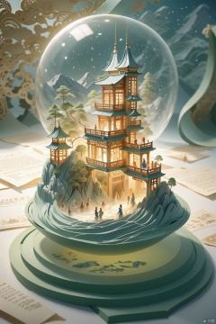 gold,paper cuttings,bronzing process,an open scrool floating in the air,with some ancient characters on it. on the open scroll stand several ancient poets,with illustrations of mountains and rivers in the background. featuring undulating mountains,silk,macro,high-definition surrealism,long waves,fresh and elegant customs,white and blue tones,macro perspective,c4d,glass material,oc renderer,dreamy,combination of ancient and futuristic,three-dimensional ancient style,large area blank,Chen Wild,shift axis photography,backlight,volume light,natural light,stage light,clean background,3d style Science Fiction,