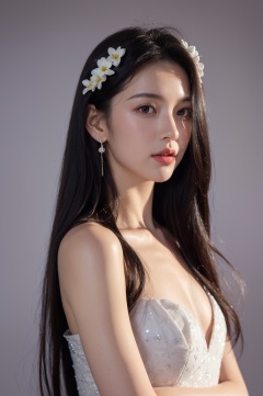 1girl, solo,(front view:1.2),(looking_at_viewer:1.4),(eye-contact:1.4),,black hair, long hair, jewelry, realistic, earrings, hair ornament, black eyes, lips, collarbone, parted lips, flower, watermark, upper body, portrait, hair flower, dress, web address, <lora:YG红颜阁美女2:0.75>,