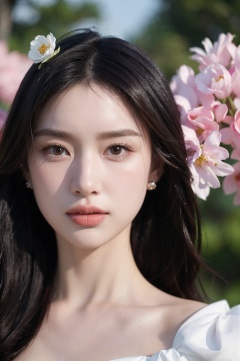 1girl, solo,(front view:1.2),(looking_at_viewer:1.4),(eye-contact:1.4),,black hair, long hair, jewelry, realistic, earrings, hair ornament, black eyes, lips, collarbone, parted lips, flower, watermark, upper body, portrait, hair flower, dress, web address,  <lora:YG红颜阁美女4:0.8>,
