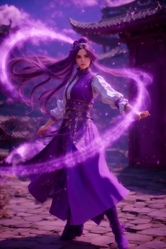 purple-aura,using purple-magic,purple-magic,ancient-costume,dancing,fighting stance,1girl,solo,long hair,brown hair,<lora:magic_fighting_purple_512_15:0.8>,