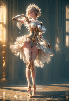 (((masterpiece))),(((best quality))),((ultra-detailed)),(highly detailed CG illustration),((an extremely delicate and beautiful)),(cute delicate face),cinematic light,1girl,full body,(machine made joints:1.4),((machanical limbs)),hair ornament,dancing,corset,dress,high heels,bokeh photography,(soft focus):1.2,out-of-focus highlights,dreamy ambiance,glowing circles,mesmerizing depth,hyperrealism,(photorealistic detail):1.2,incredible accuracy,lifelike textures,masterful technique,jaw-dropping precision,artistic dedication,