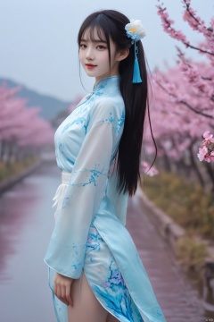 Surrealism Dream Style,glowing neon color,RAW photo,at night,1girl,solo,sea,black hair,ponytail,looking at viewer,long hair,up,lips,sash,water splaashing,hair ornament,realistic,wide sleeves,hanfu,long dress,Semi transparent gauze skirt,surrealist,Best quality,masterpiece,ultra high res,Petal skirt,wind,flowers,bloom,Clouds,smoke,neon lights, 1 girl,, Xcheongsam