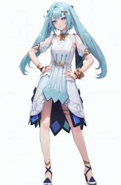 8k,best quality,masterpiece,(ultra-detailed:1.1),(high detailed skin),(full body:1.4),white background,standing,looking at viewer,(solo),hand on hip,<lora:fls-v100:0.8:lbw=OUTALL>,fls,def clothe,1girl,dress,jewelry,bracelet,twintails,long hair,hair ornament,bangs,(white background, simple background:1.6),(beautiful_face),((intricate_detail)),clear face,((finely_detailed)),fine_fabric_emphasis,((glossy)),full_shot,