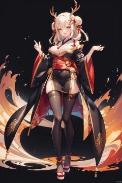 (extremely detailed CG, best quality:1.1), 1girl, perfect face, bright pupils, (finely detailed beautiful eyes:1.1), half-closed eyes, shiny skin, lustrous skin, wide hips, narrow waist, double bun, yellow eyes, horns, antlers, hair ornament, japanese clothes, black kimono, pantyhose, black bodystocking, bow, :d, large breasts, black high heels, full body, standing, v legs,