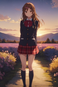 <lora:Shinka-000011:0.8>,Shinka CYQL,1girl,looking at viewer,solo,long hair,brown hair,one side up,brown eyes,hairclip,hair ornament,school uniform,skirt,plaid,plaid skirt,socks,kneehighs,tearing_up,bust,Lavender, Fields, Purple, Fragrance, Bees, Horizon, Serenity, Sunset,(Date palms, Cacti, Oasis pool, Hot sand, Glaring sunlight, Mirage:0.5),beautiful detailed sky,beautiful detailed glow,posing in front of a colorful and dynamic background,masterpiece,best quality,beautiful and aesthetic,contrapposto,female focus,wallpaper,