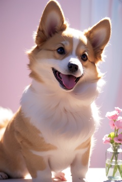A doge with a tiny tail, a small nose, small ears, blue eyes, pink background, flowers, vases, dreams, open mouth, smile, Caroline Chariot-Dayez pastels, tumblr style, furry art, elokitty, Disney's Bambi dog, Disney's stylized furry, ears floating, fluffy tail, (fluffy:1.4), high resolution, furry art, The moon, small in size, mangguo_keji, <lora:YG可爱柯基:0.75>,