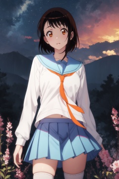 <lora:Kosaki-000013:0.8>,Kosaki CYQL,1girl,looking at viewer,solo,brown hair,short hair,asymmetrical hair,brown eyes,school uniform,serafuku,skirt,blue skirt,zettai ryouiki,female_orgasm,panorama,Lavender, Hills, Purple blooms, Fragrance, Bees, Farmhouse, Sunset,(Winter garden, Snow-covered landscape, Frosty blooms, Snowflakes, Winter wonderland, English charm:0.5),beautiful detailed sky,beautiful detailed glow,posing in front of a colorful and dynamic background,masterpiece,best quality,beautiful and aesthetic,contrapposto,female focus,wallpaper,