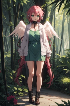 <lora:Ikaros-000009:0.8>,ikaros cyql,1girl,looking at viewer,solo,pink hair,long hair,very long hair,twintails,robot ears,hair ribbon,green eyes,collar,metal collar,chain,wings,angel wings,large breasts,Aran sweater duster coat worn over a sweater dress and heeled booties,shy,bust,Tall bamboo stalks stand upright in close proximity, their leaves rustling softly in the breeze, while sunlight filters through the gaps, casting dappled shadows,(Bonsai trees, Moss, Gravel pathways, Raked sand, Tranquility, Meditation:0.5),beautiful detailed sky,beautiful detailed glow,posing in front of a colorful and dynamic background,masterpiece,best quality,beautiful and aesthetic,contrapposto,female focus,wallpaper,