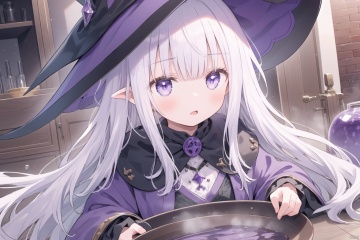 1girl, white hair, purple eyes, witch hat, brewing potion, magic circle, bubbling cauldron, musty dungeon, extremely detailed