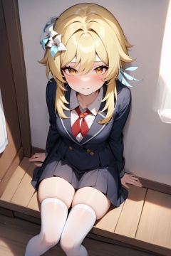 masterpiece,best quality,very aesthetic,absurdres,1girl,lumine \(genshin impact\),solo,blonde hair,sitting,<lora:lumine-000006:0.6>,school uniform,white thighhighs,knees together feet apart,room,sitting on floor,against wall,from above,