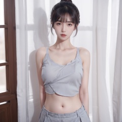 1girl,arms_behind_back,black_hair,breasts,brown_eyes,collarbone,curtains,hair_bun,lips,looking_at_viewer,mole,realistic,solo,standing(bellyband:1.3),<lora:20231109-1699510907344:0.6>