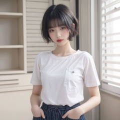 masterpiece, best quality, 32k, insane details, intricate details,,1girl, fashion photography, in style of angura kei,hime - cut, straight hair,in a minimalist Misasakan room,high-wistskirt,cllaredshirt,(short hair:1.4),striped,blunt bangs,(Mole under eye:1.0),hand in pocket,flower,,<lora:meinv76:0.6>