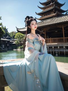 In the mystical realm of the jade pool,there lies a celestial palace of unprecedented grandeur. Nestled amidst this stunning scenery,a woman of ethereal beauty captures the gaze. Dressed in flowing robes of the finest silk,colour matched to the scene with brilliant hues of azure and lavender,she exudes an air of tranquillity and grace. Her hair,dark as a moonless night,cascades seamlessly down her shoulders. A slight smile graces her lips,hinting at a wisdom older than the star-speckled heavens above. Surrounding her,the palace shimmers with a heavenly light,its spectacular architecture reflecting the ethereal glow of the spirit world. Lush greenery springs from every crevice,adding a flourish of natural elegance to this divine setting,