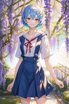<lora:Rei-000011:0.6>,Rei CYQL,1girl,looking at viewer,solo,blue hair,red eyes,hair between eyes,medium breasts,Rei School,short hair,tokyo-3 middle school uniform,collarbone,white shirt,short sleeves,red ribbon,white sailor collar,blue skirt,suspender skirt,black socks,white shoes,grin,portrait,Wisteria vines,Garden party,Outdoor dining,Floral canopy,Summer celebration,English charm,(Maple trees, Acorns, Mushrooms, Fallen leaves, Golden sunlight, Rustling breeze:0.5),beautiful detailed sky,beautiful detailed glow,posing in front of a colorful and dynamic background,masterpiece,best quality,beautiful and aesthetic,contrapposto,female focus,wallpaper,