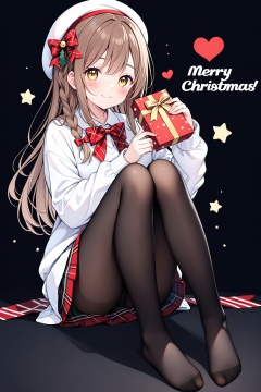 (masterpiece),(best quality),solo,1girl,pantyhose,smile,brown hair,hat,blush,no shoes,looking at viewer,black pantyhose,sweater,braid,black background,long hair,heart,long sleeves,sitting,bow,skirt,merry christmas,brown eyes,kunikida hanamaru,hair bow,white headwear,beret,christmas,holding,plaid,full body,bangs,closed mouth,yellow eyes,gift,red bow,simple background,