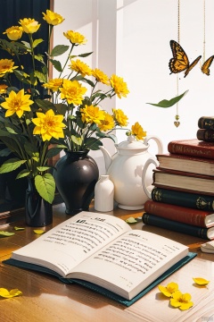 flower, book, no humans, leaf, plant, yellow flower, still life