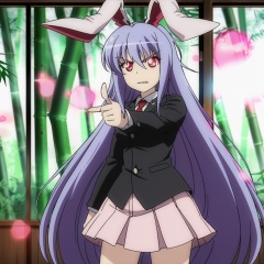 masterpiece, best quality, <lora:tgm-xl-a3.1:1>, anime coloring, reisen udongein inaba, 1girl, animal ears, long hair, rabbit ears, solo, red eyes, very long hair, forest, skirt, bamboo, bamboo forest, nature, glowing, jacket, purple hair, blazer, finger gun, glowing eyes, parody, necktie, light purple hair, pleated skirt, blue hair