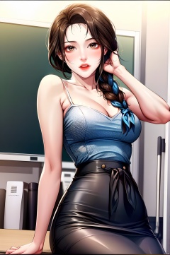 yuanshen,1girl,solo,brown hair,brown eyes,braid,hair over shoulder,looking at viewer,long hair,parted lips,ribbon,lips,hair ribbon,teacher,classroom,blackboard,shirt, skirt, pencil skirt,mature female,single braid,camisole,cowboy_shot,sitting,arms support,perfect balance,looking at viewer,(Focus on her face),(innocent_big_eyes:1),(Light_Smile:0.3),official art,extremely detailed CG unity 8k wallpaper,perfect lighting,Colorful,Bright_Front_face_Lighting,(masterpiece:1),(best_quality:1),ultra high res,4K,ultra-detailed,photography,8K,HDR,highres,absurdres:1.2,Kodak portra 400,film grain,blurry background,bokeh:1.2,lens flare,(vibrant_color:1.2),professional photograph,(beautiful_face:1.5),(narrow_waist),nice hands