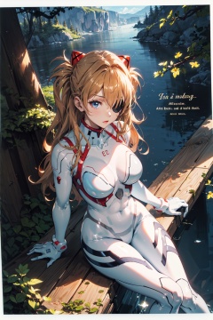<lora:Asuka-000018:0.8>,Asuka CYQL,1girl,looking at viewer,solo,long hair,blue eyes,interface headset,brown hair,orange hair,hair between eyes,two side up,medium breasts,(Asuka White,eyepatch,plugsuit,bodysuit,white bodysuit,skin tight),(giggling:1.2),beautiful face,beautiful eyes,glossy skin,shiny skin,(portrait,from_above,sitting:1.2),clenched hands,Redwoods, Giant trees, Ferns, Moss, Sunlight, Wildlife, Tranquility, Oxygen,Roses,beautiful detailed sky,beautiful detailed glow,(English text:1.3),(border:1.5),posing in front of a colorful and dynamic background,(masterpiece, best quality, beautiful and aesthetic:1.3),contrapposto,female focus,fine fabric emphasis,wallpaper,fashion,Lipstick,depth of field,intricate_detail,finely_detailed,fine_fabric_emphasis,(glossy),<lora:增强减少细节add_detail:0.3>,
