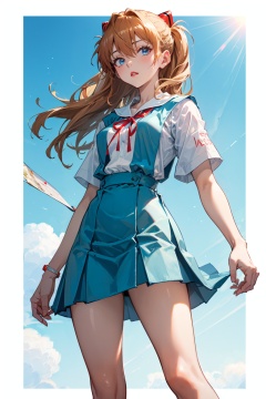 <lora:Asuka-000018:0.8>,Asuka CYQL,1girl,looking at viewer,solo,long hair,blue eyes,interface headset,brown hair,orange hair,hair between eyes,two side up,medium breasts,(Asuka School,tokyo-3 middle school uniform,shirt,skirt,white shirt,blue skirt,ribbon,neck ribbon,red ribbon,short sleeves,suspender skirt,hair ornament),(teardrop:1.2),beautiful face,beautiful eyes,glossy skin,shiny skin,(bust,from_below,standing:1.2),hand in panties,Traditional garden, Kite flying, Afternoon sun, Breeze, Joy,Jasmine,beautiful detailed sky,beautiful detailed glow,(English text:1.3),(border:1.5),posing in front of a colorful and dynamic background,(masterpiece, best quality, beautiful and aesthetic:1.3),contrapposto,female focus,fine fabric emphasis,wallpaper,fashion,Lipstick,depth of field,intricate_detail,finely_detailed,fine_fabric_emphasis,(glossy),<lora:增强减少细节add_detail:0.3>,