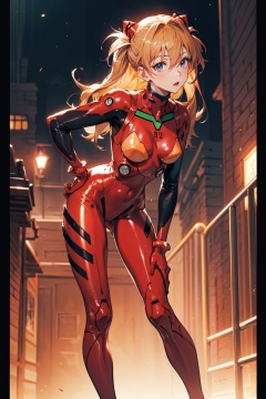 <lora:Asuka-000018:0.8>,Asuka CYQL,1girl,looking at viewer,solo,long hair,blue eyes,interface headset,brown hair,orange hair,hair between eyes,two side up,medium breasts,(Asuka Red,plugsuit,bodysuit,red bodysuit,floating hair,skin tight,long legs,two-tone sleeves),(moaning:1.2),beautiful face,beautiful eyes,glossy skin,shiny skin,(full_shot,front view,leaning forward:1.2),hand on hip,Ancient theater, Shadow puppetry, Dusk, Storytelling, Cultural heritage,Tulips,beautiful detailed sky,beautiful detailed glow,(English text:1.3),(border:1.5),posing in front of a colorful and dynamic background,(masterpiece, best quality, beautiful and aesthetic:1.3),contrapposto,female focus,fine fabric emphasis,wallpaper,fashion,Lipstick,depth of field,intricate_detail,finely_detailed,fine_fabric_emphasis,(glossy),<lora:增强减少细节add_detail:0.3>,