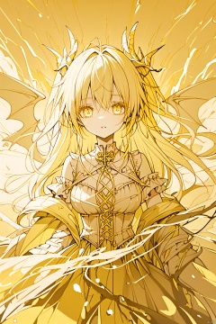 (anime art: 1.21), (dragon: 1.1), (dragon in background: 1.21), 1girl with wings on back, looking at viwer, snake eyes, (yellow theme: 1.5), (monochrome: 1.1), (ethereal beauty: 1.4), (captivating lighting: 1.2), (ethereal aura: 1.3), (mysterious ambiance: 1.2), (thunder in the distance: 1.2), (fantasy art: 1.3), (ethereal scene: 1.3), , masterpiece,best quality,8k,insane details,intricate details,high detail,((masterpiece)), ((best quality))