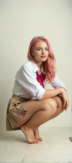 1 girl, flame body, masterpiece, top quality, beautiful and aesthetic:1.2, (1girl:1.3), (full body:1.5), leonard,looking at viewer, extreme detailed,cinematic lighting, story, narrative quality, ((crouched on tiptoes)),colorful gradient,  pink hair golden skin,score_9 score_8_up score_7_up,((gigantic boobs pink hair golden skin jk school uniform.,(score_9:0.6) score_8_up realistic photo,virgoart style,fantasy clothes futuristic japan culture,crotch tattoo