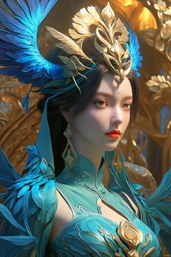 Best Quality, masterpiece, ultra-high resolution, (photo realistic: 1.4) , Surrealism, Fantastical verisimilitude, beautiful blue-skinned goddess Phoenix Peacock on her head, fantastical creation, thriller color scheme, surrealism, abstract, psychedelic, 1 girl,flower,castle,jyy-hd,1 girl,(big breasts:1.39),,Xliushen,Xyunxi,Xhuolinger,X-Hydrangea,Hydrangea, ty-hd