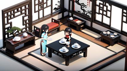 masterpiece,best quality,<lora:gamebg:0.5>,3d,white background,chibi girl,(1girl,solo,long hair,black hair,china dress, :1.6),room-style,dark wood flooring,traditional Chinese wooden lattice walls,intricate carvings,flower and auspicious patterns,classic lattice windows,white paper coverings,natural light,blue and white porcelain vases,bonsai,elegant atmosphere,low redwood tea tables,tea chairs,detailed carvings,exquisite tea sets,teapots,teacups,tea trays,blue and white porcelain,purple clay,ink paintings,landscape and bamboo,cultural ambiance,bookshelves,ancient books,tea books,tea art performance area,classic tea table,bench,traditional tea ceremony,indoor pond,koi fish,green stones,peaceful ambiance,traditional Chinese lanterns,flower and poetry designs,warm lighting,light tea fragrance,classical and serene atmosphere,