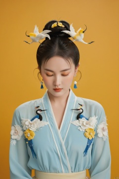 new chinese style,1girl,solo,closed eyes,black hair,hair bun,flower,bird,hair ornament,standing,blush,long sleeves,yellow background,crane (animal),double bun,blue flower,bangs,white flower, symmetrical composition,, masterpiece,best quality,very aesthetic,absurdres,