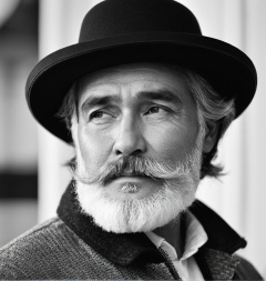 Gray,Monochrome,(black-and-white photograph:1.5),1boy,male focus,beard,monochrome,facial hair,solo,greyscale,hat,old,closed mouth,old man,closed eyes,portrait,realistic,long hair,profile,mustache,from side,,<lora:heibaishey:0.8>