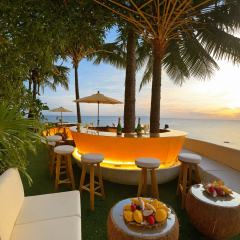 skybar,<lora:20240705-1720127504546:0.6>,seaside bar,best picture quality,masterpiece,open air,over the sea,(coconut tree:1.2),beach,ocean,fresh decoration,champagne,beach,drink,(grass stool:1.1),(grass umbrella:1.1),tropical fruits,seaside plants,(sunset:1.1),(a bar made of shells:1.1),night,